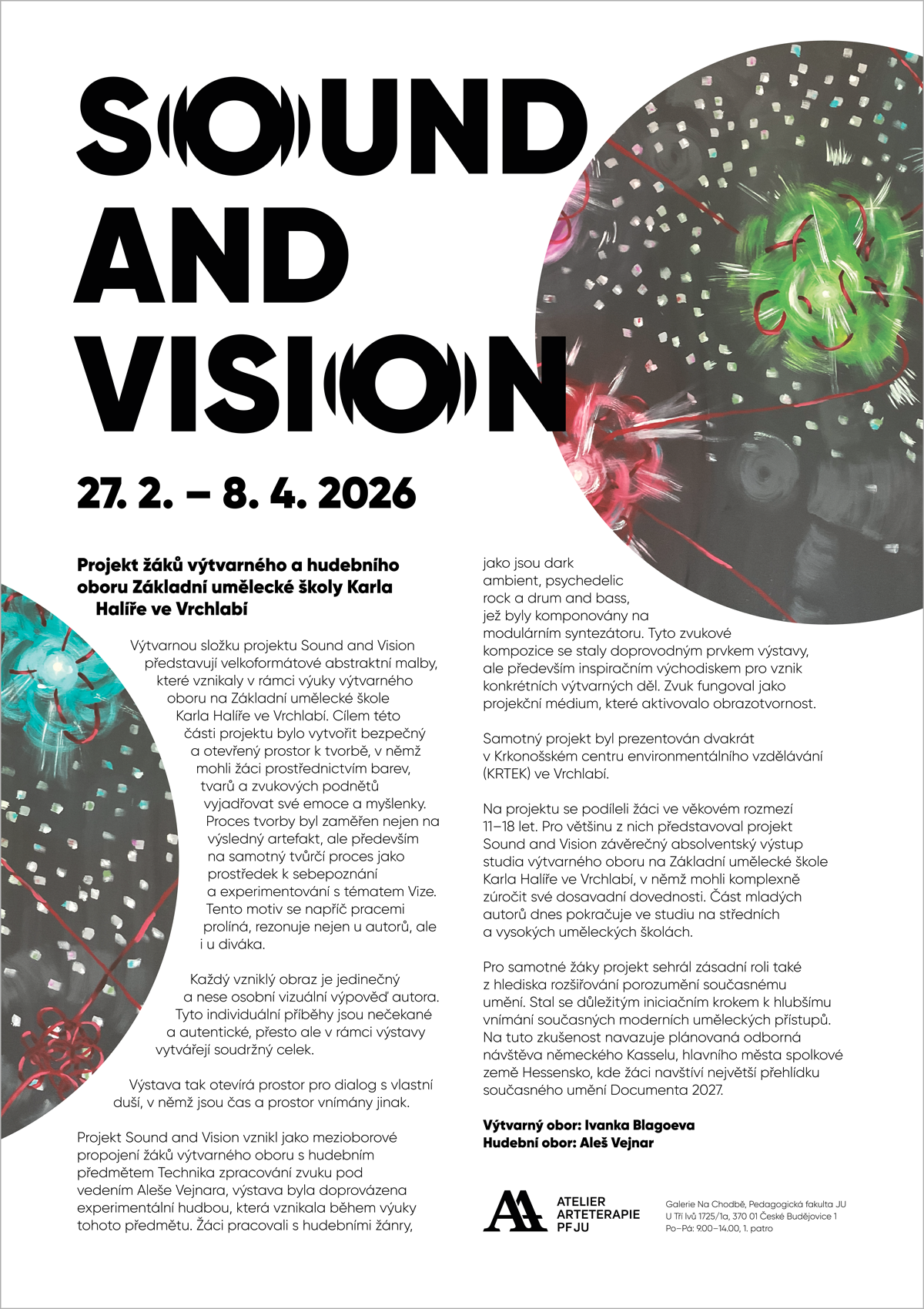 Dovolujeme si vás pozvat na výstavu SOUND AND VISION, která je projektem jedenáctiletých až osmnáctiletých žáků výtvarného a hudebního oboru Základní umělecké školy Karla Halíře ve Vrchlabí. Většina z těchto žáků nyní pokračuje ve studiu na středních a vysokých uměleckých školách. Výstava v Galerii Na Chodbě nabídne jedinečné propojení výtvarného a hudebního prožitku a potrvá od pátku 27. 2. 2026 do 8. 4. 2026. Vernisáž se koná 27. února od 19,15. Všichni jste srdečně zváni!