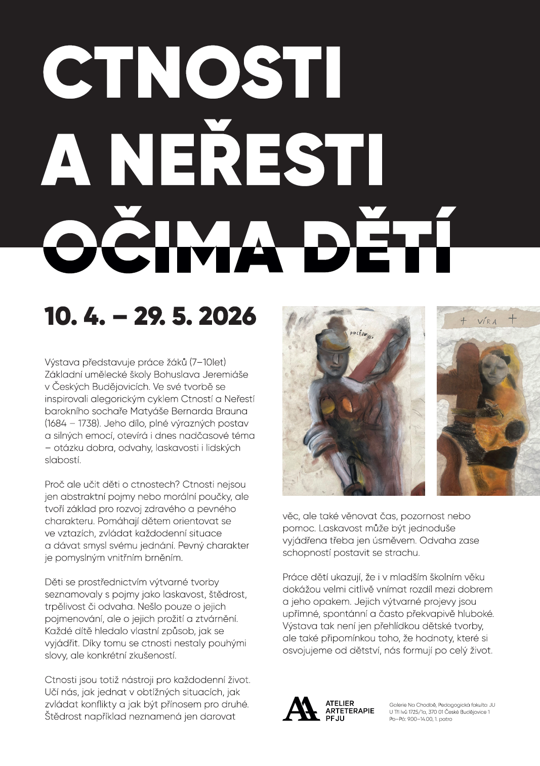 V galerii Na Chodbě budeme mít možnost seznámit se s výtvarnými pracemi žáků výtvarného oboru ze Základní školy Bohumila Jeremiáše v Českých Budějovicích. Děti mladšího školního věku (7–10 let) zde svými výtvarnými pracemi ztvárňují laskavost, štědrost, trpělivost i odvahu. Výstava potrvá od 10. dubna do 29. května 2026! Těšíme se na vás, věříme, že si tuto skvělou přehlídku dětské tvorby nenecháte ujít!