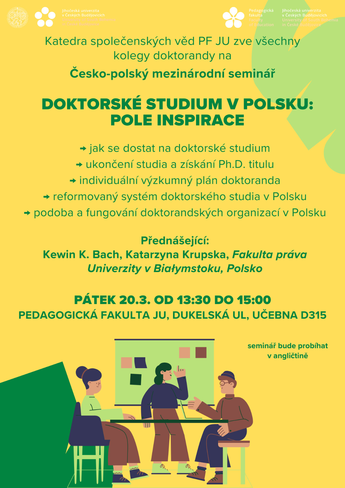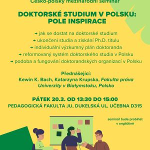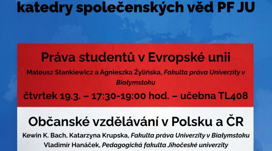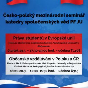 Díky nasazení a entuziasmu dr. Hanáčka patřila druhá polovina března na naší katedře česko-polské meziuniverzitní spolupráci. Nejprve jsme ve dnech 19.-20. března uspořádali historicky první Česko-polský mezinárodní seminář naší katedry, jehož se účastnili doktorandi z Právnické fakulty Univerzity v Białymstoku Katarzyna Krupska, Kewin Konrad Bach a Mateusz Stankiewicz. V prvním bloku jsme se věnovali právům studentů v EU a možnostem mezinárodních výměn. Ve druhém pak podobě občanského vzdělávání v Polsku a srovnáním s našimi domácími poměry. Zde zaujaly zejména mimoškolní celoživotní formy v podobě tzv. občanského rozpočtu či akademických participativních projektů, které v Česku dosud ekvivalent nemají. Konečně třetí blok byl zaměřen na průběh doktorského studia v Polsku, který otevřel mnohé pole inspirace nejen pro vznikající školy doktorských studií u nás.