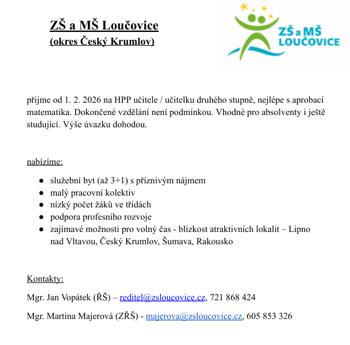 Kontaktní osoba: Mgr. Jan Vopátek (ŘŠ) – Tato e-mailová adresa je chráněna před spamboty. Pro její zobrazení musíte mít povolen Javascript., 721 868 424; Mgr. Martina Majerová (ZŘŠ) - Tato e-mailová adresa je chráněna před spamboty. Pro její zobrazení musíte mít povolen Javascript., 605 853 326