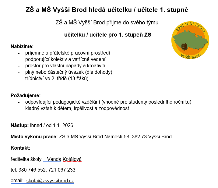 Organizace: ZÁKLADNÍ ŠKOLA A MATEŘSKÁ ŠKOLA VYŠŠÍ BROD, Náměstí 58, 382 73 Vyšší Brod