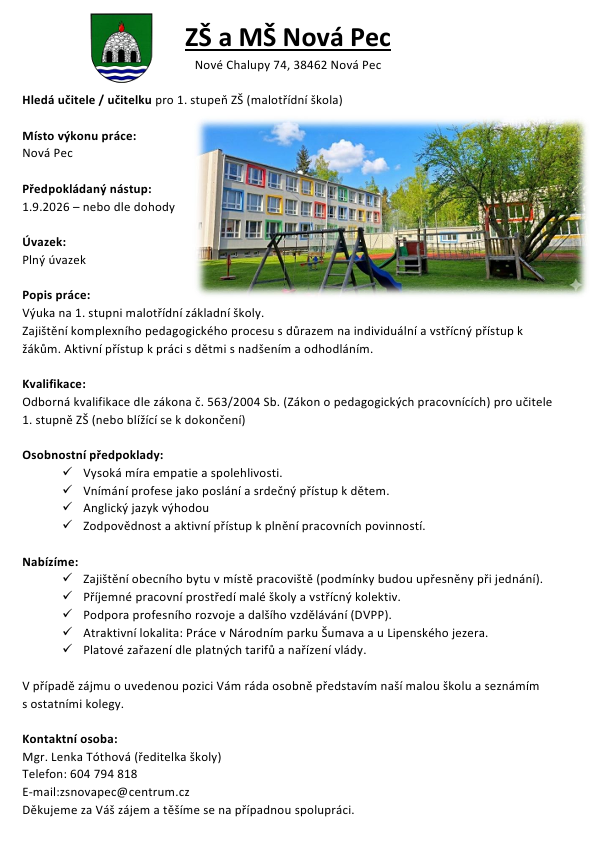 Organizace: ZŠ a MŠ Nová Pec, Nové Chalupy 74, 38462 Nová Pec