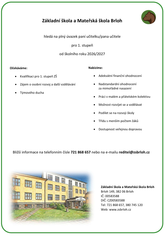 Organizace: Základní škola a mateřská škola Brloh, Brloh 149, 382 06 Brloh