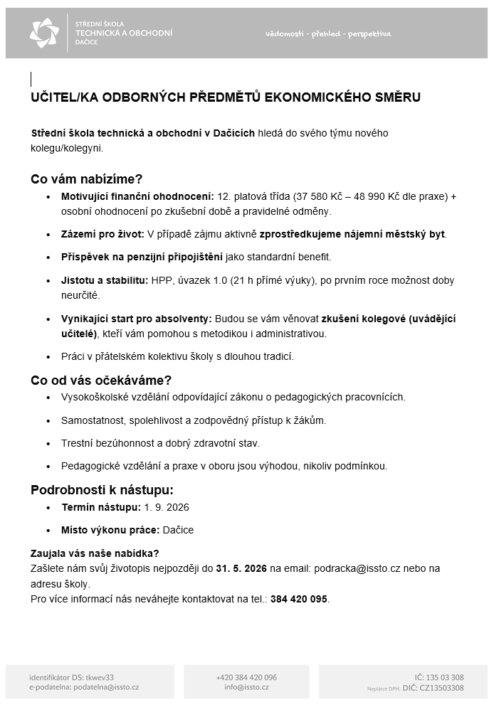 • Organizace: Střední škola technická a obchodní, Strojírenská 304, 380 01 Dačice