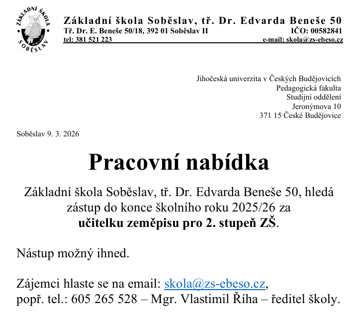 Organizace: Základní škola Soběslav, tř. Dr. Edvarda Beneše 50/18 392 01 Soběslav II
