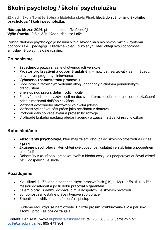 Své CV a motivační dopis zašlete na email: This email address is being protected from spambots. You need JavaScript enabled to view it. , tel. 312 606 147