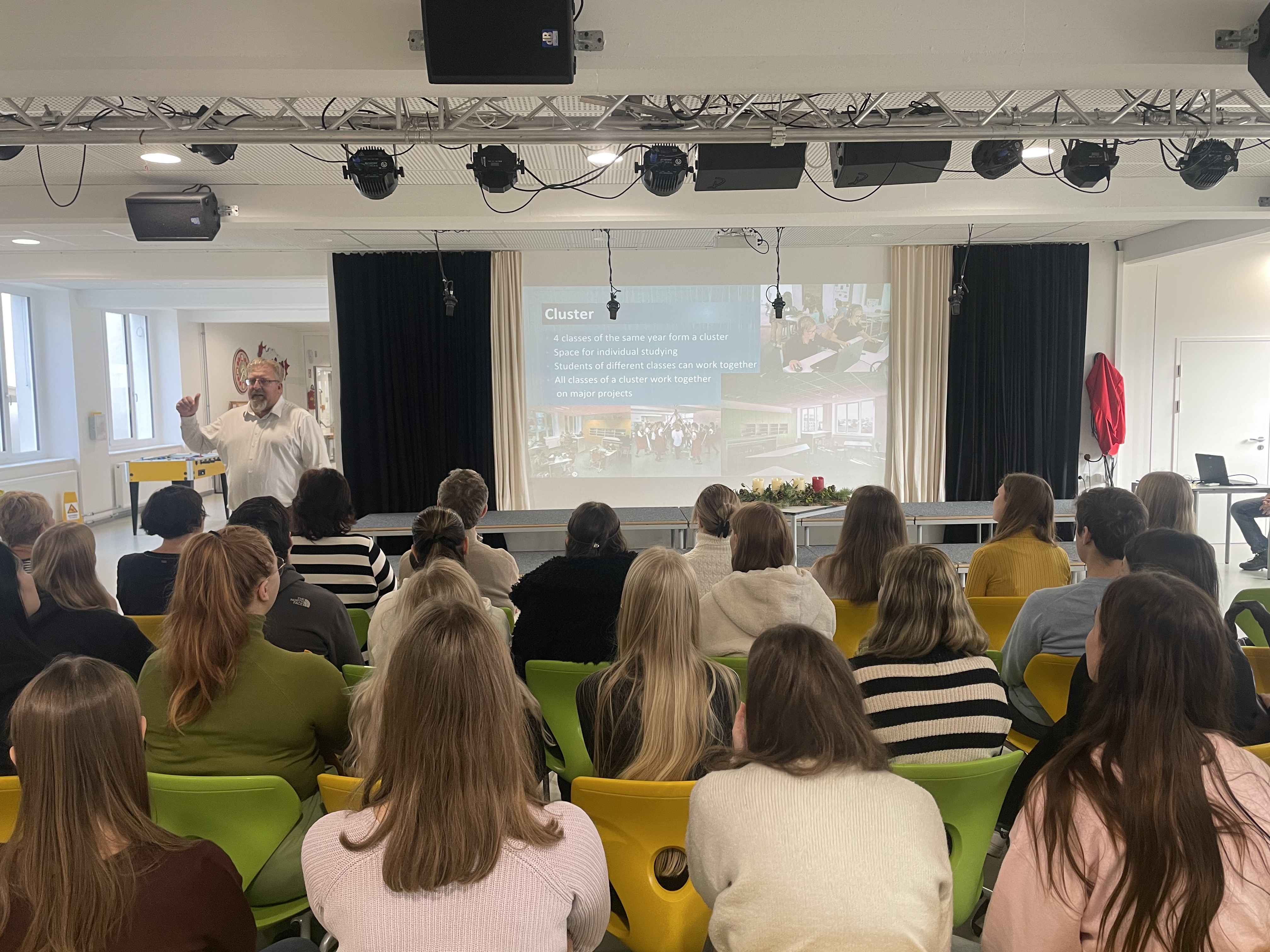 V další části exkurze se účastníci zapojili do náslechů ve výuce, kde měli možnost sledovat otevřené a projektově orientované formy učení, spolupráci žáků napříč třídami i specifické propojení jazykové, hudební a pohybové složky výuky. Po hospitacích se návštěvníci zapojili do odborné diskuse s rakouskými kolegy zaměřené na organizaci výuky, pedagogické přístupy a srovnání rakouského a českého školského kontextu.