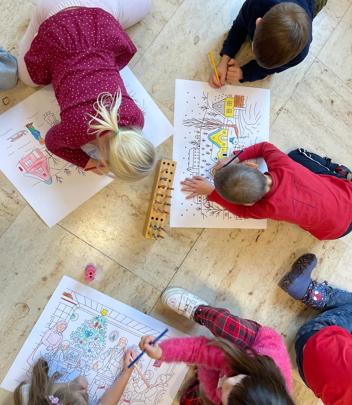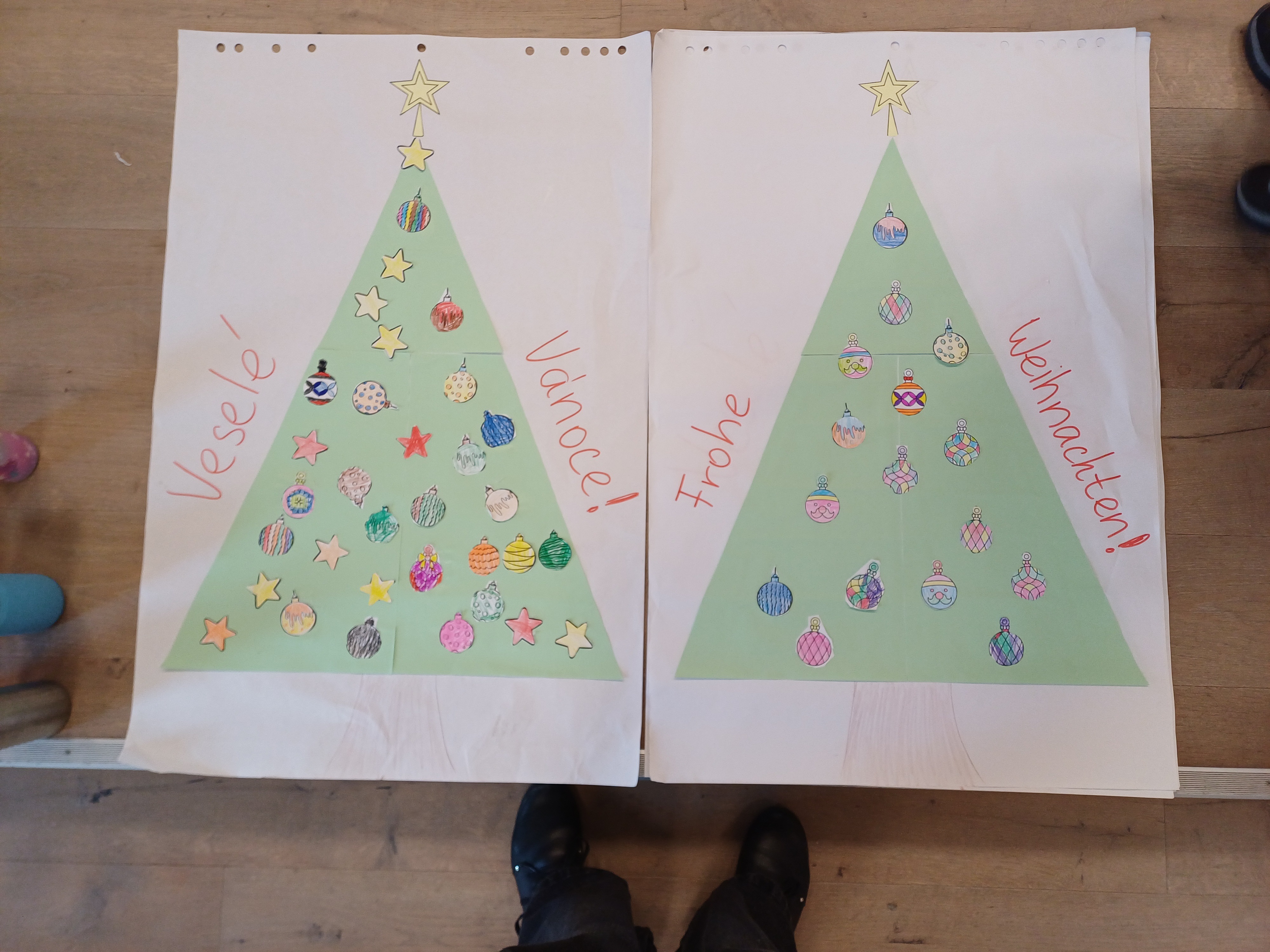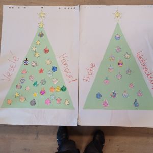 Po malém občerstvení se děti losováním rozdělily do jazykově smíšených skupinek a pustily se do práce na stanovištích, která byla připravena tak, aby podporovala vzájemnou komunikaci, tvořivost i radost ze spolupráce. Společně vybarvovaly omalovánky na motivy obrázků Josefa Lady, zdobily vánoční stromeček, vyráběly papírový vánoční řetěz, vyzdobily sněhuláka, doplňovaly kaprovi šupiny, počítaly, modelovaly vánoční motivy a fotily se ve fotokoutku.