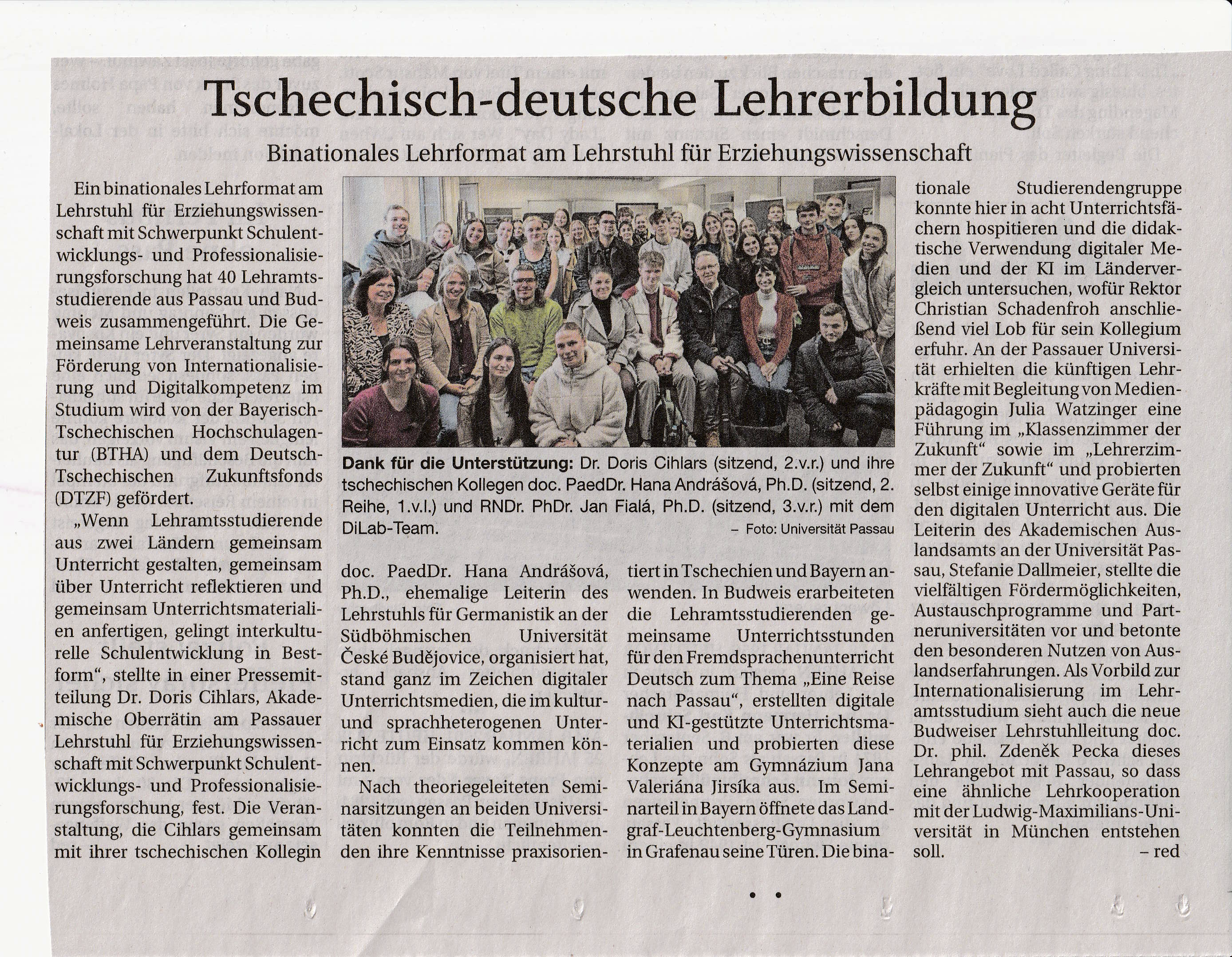 Dne 8. ledna 2026 přinesl regionální deník Passauer Neue Presse obsáhlý článek věnovaný dlouhodobému vzdělávacímu projektu mezi Pedagogickou fakultou Jihočeské univerzity v Českých Budějovicích a Univerzitou v Pasově. Tradiční formát akce a účast 20 českých a 20 německých studentů významně přispěly k úspěšné realizaci obou fází projektu – v červnu v Českých Budějovicích a v listopadu 2025 v Grafenau a Pasově. Projekt bude pokračovat i v akademickém roce 2027/2028.