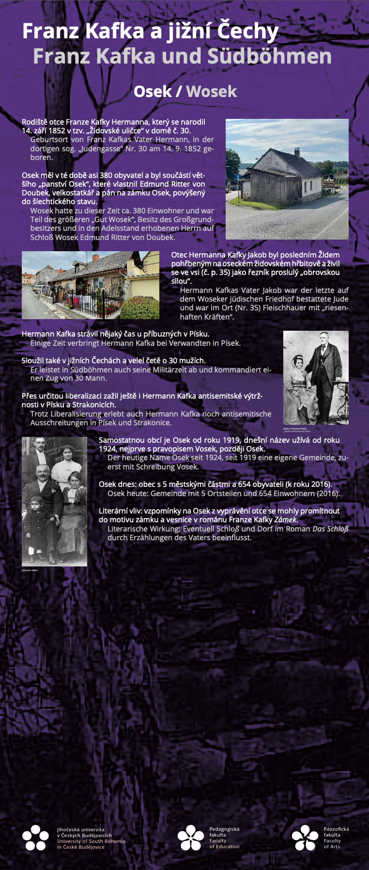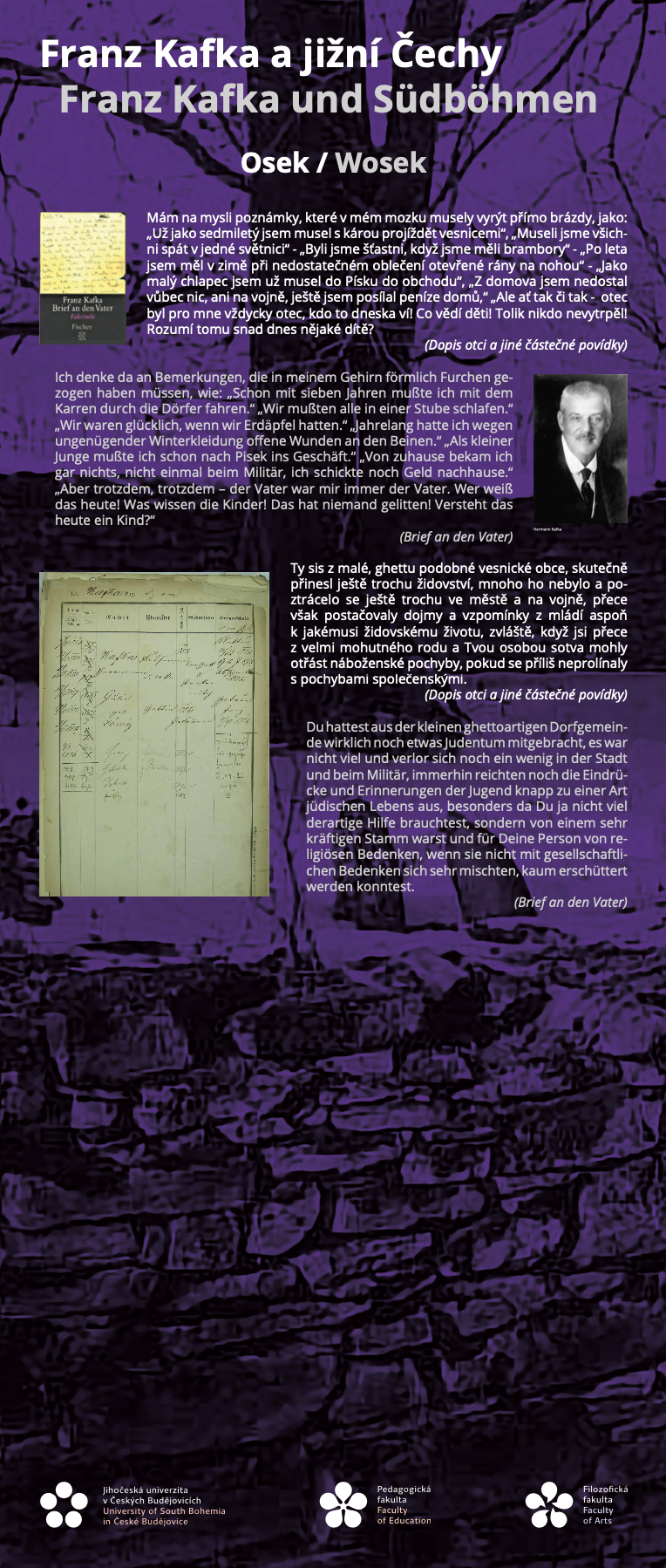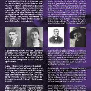 Katedra germanistiky Pedagogické fakulty Jihočeské univerzity v Českých Budějovicích představuje výstavu „Franz Kafka a jižní Čechy / Franz Kafka und Südböhmen“, která přibližuje méně známé souvislosti mezi životem a dílem Franze Kafky a regionem jižních Čech. Výstava vznikla u příležitosti 100. výročí úmrtí Franze Kafky (1924–2024) a ukazuje, že i když je Kafkovo dílo často považováno za obtížně lokalizovatelné, lze v něm nalézt konkrétní vazby na určité krajiny a místa – včetně jižních Čech.
